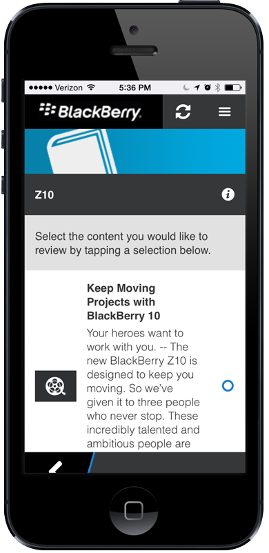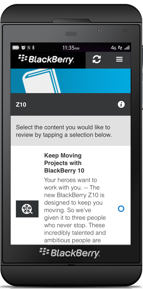 Sales reps at leading wireless carriers and big box retailers around the world were encouraged to register for BlackBerry 10 product knowledge bursts (as bespoke HTML content, marketing/technical videos, short assessments) using whichever mobile handset or tablet device they preferred – BlackBerry, Apple iOS, Google Android or Windows Phone. New content alerts leveraged device-specific push notifications to drive engagement.
